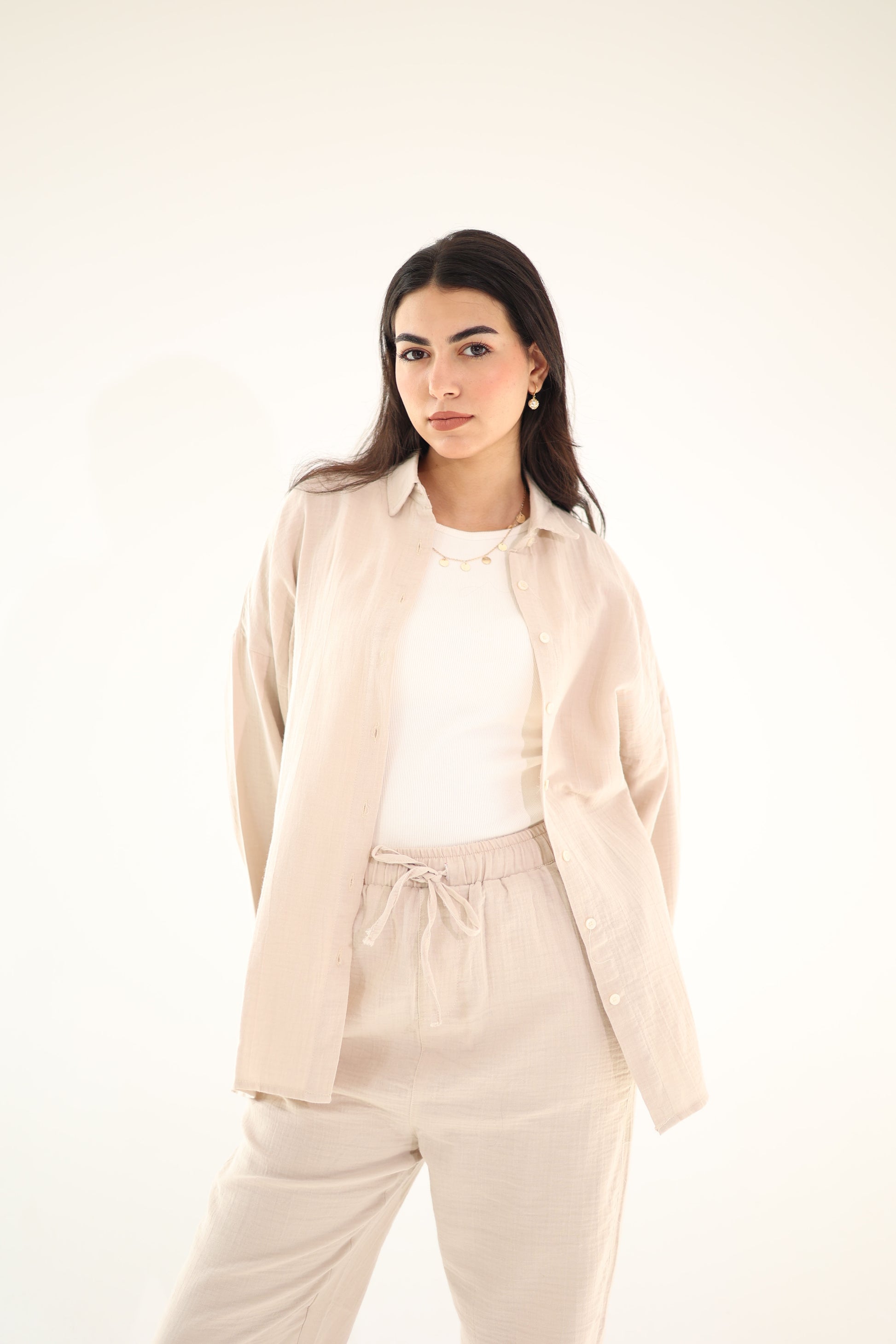 يتكوّن من قميص بأزرار أمامية بقصة مريحة وبنطلون مستقيم، ليمنحك إطلالة متوازنة بين الكاجوال والأناقة.
