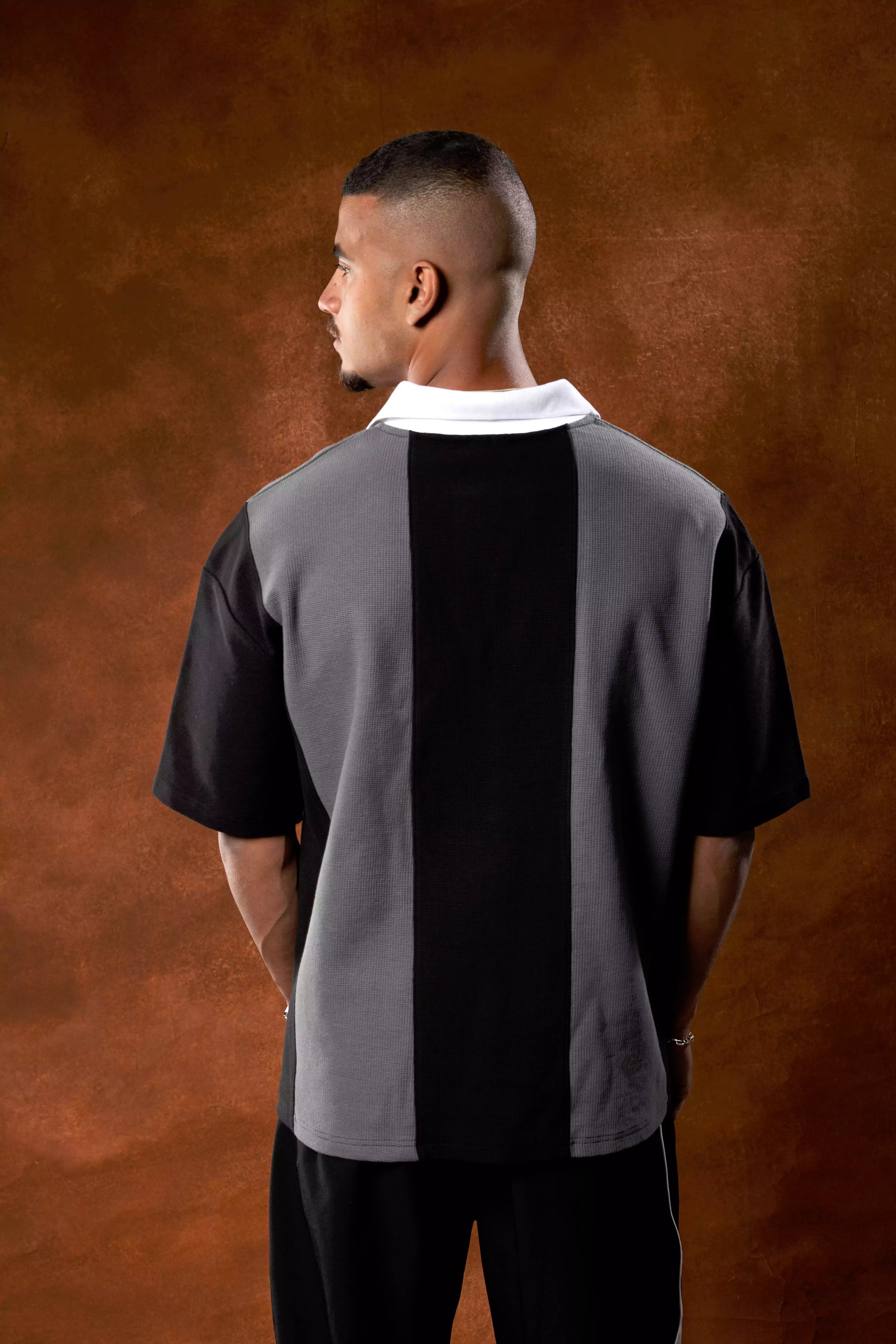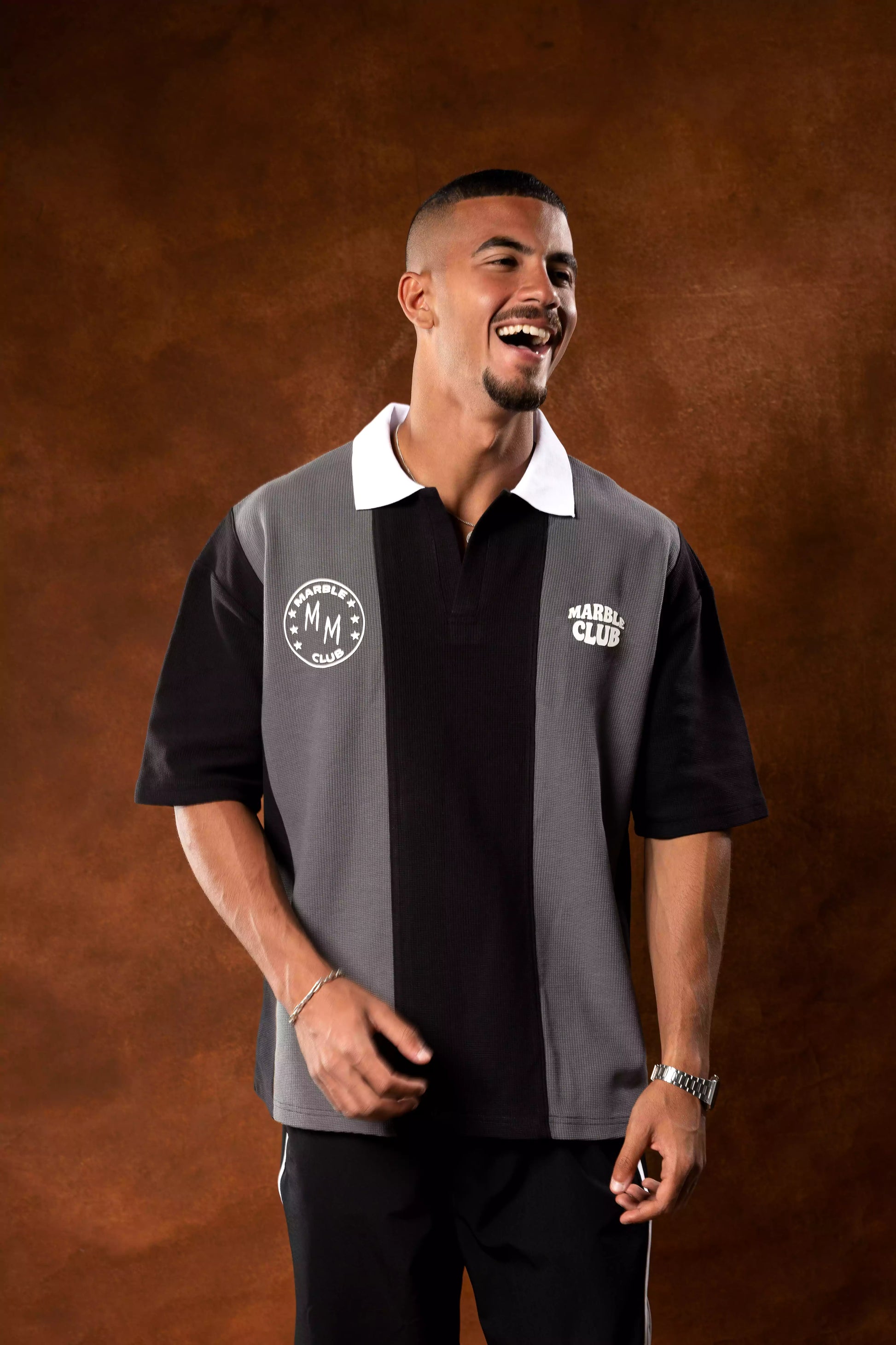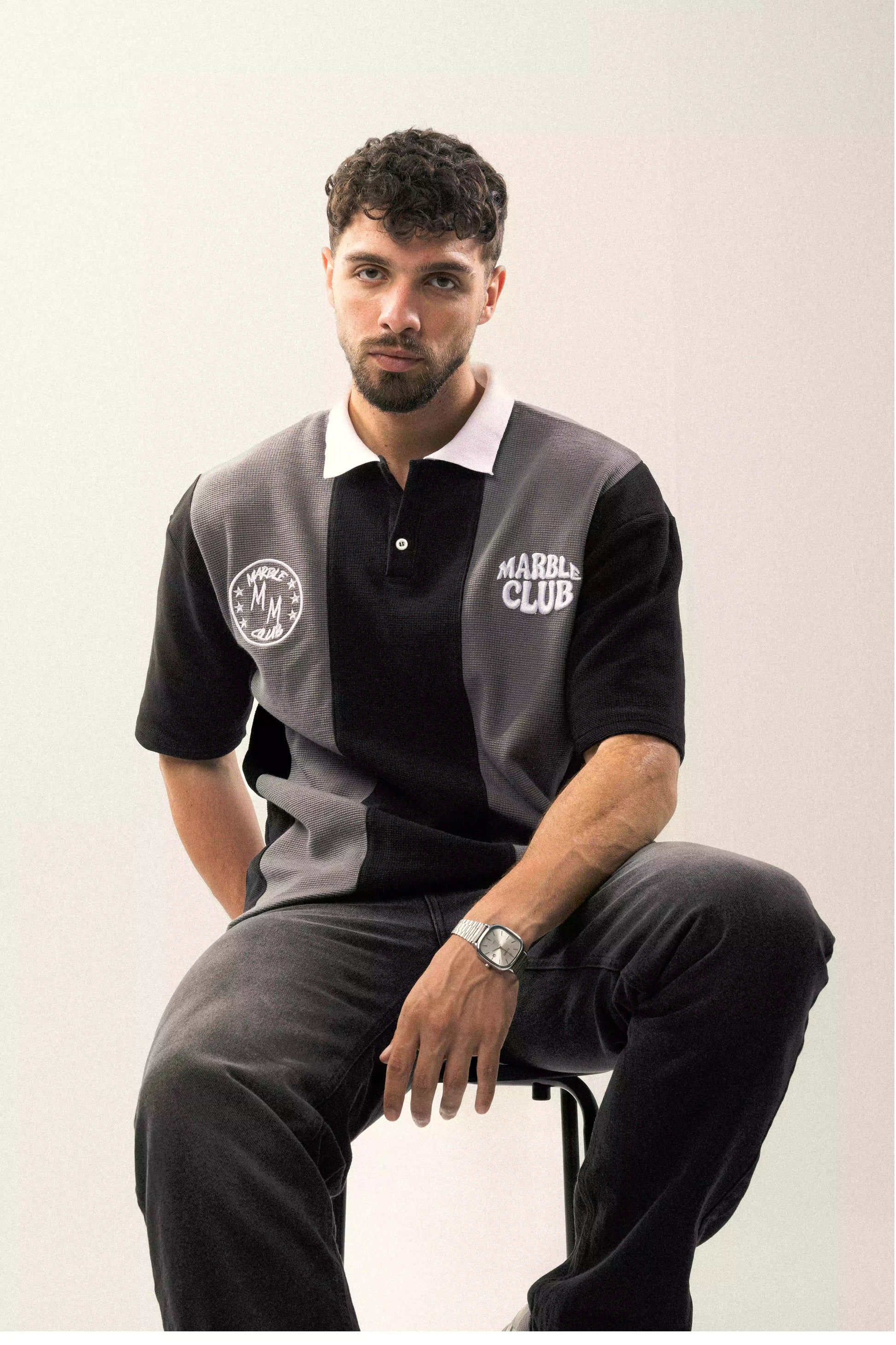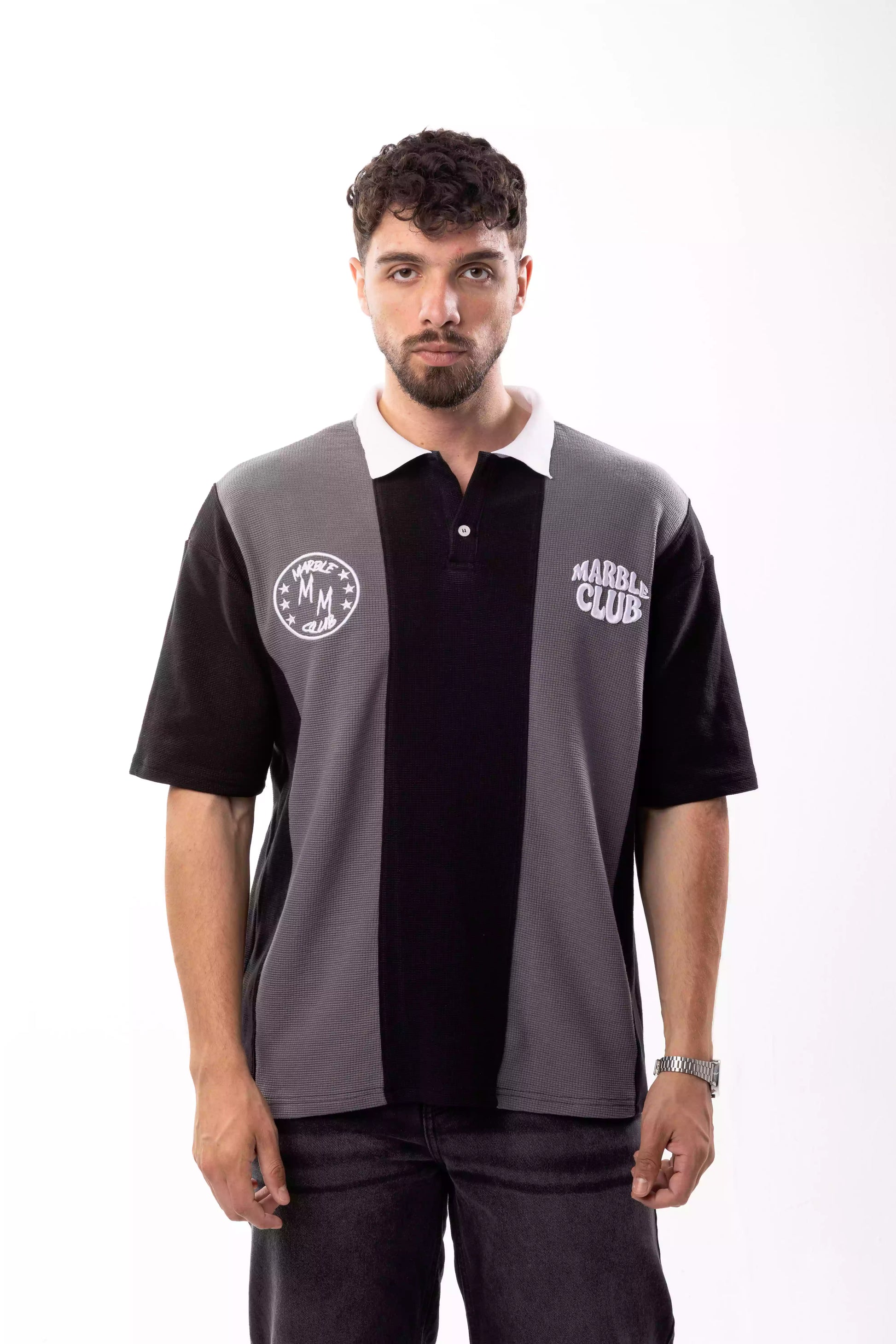 Step into effortless cool with the Marble Club Two-Tone Polo. Featuring a bold black and grey panel design with a white collar, this polo brings retro sportswear vibes with a modern edge. Crafted from premium cotton for breathability and comfort. Embellished with front "Marble Club" and logo embroidery for a standout streetwear touch. Perfect for both casual hangouts and standout looks.