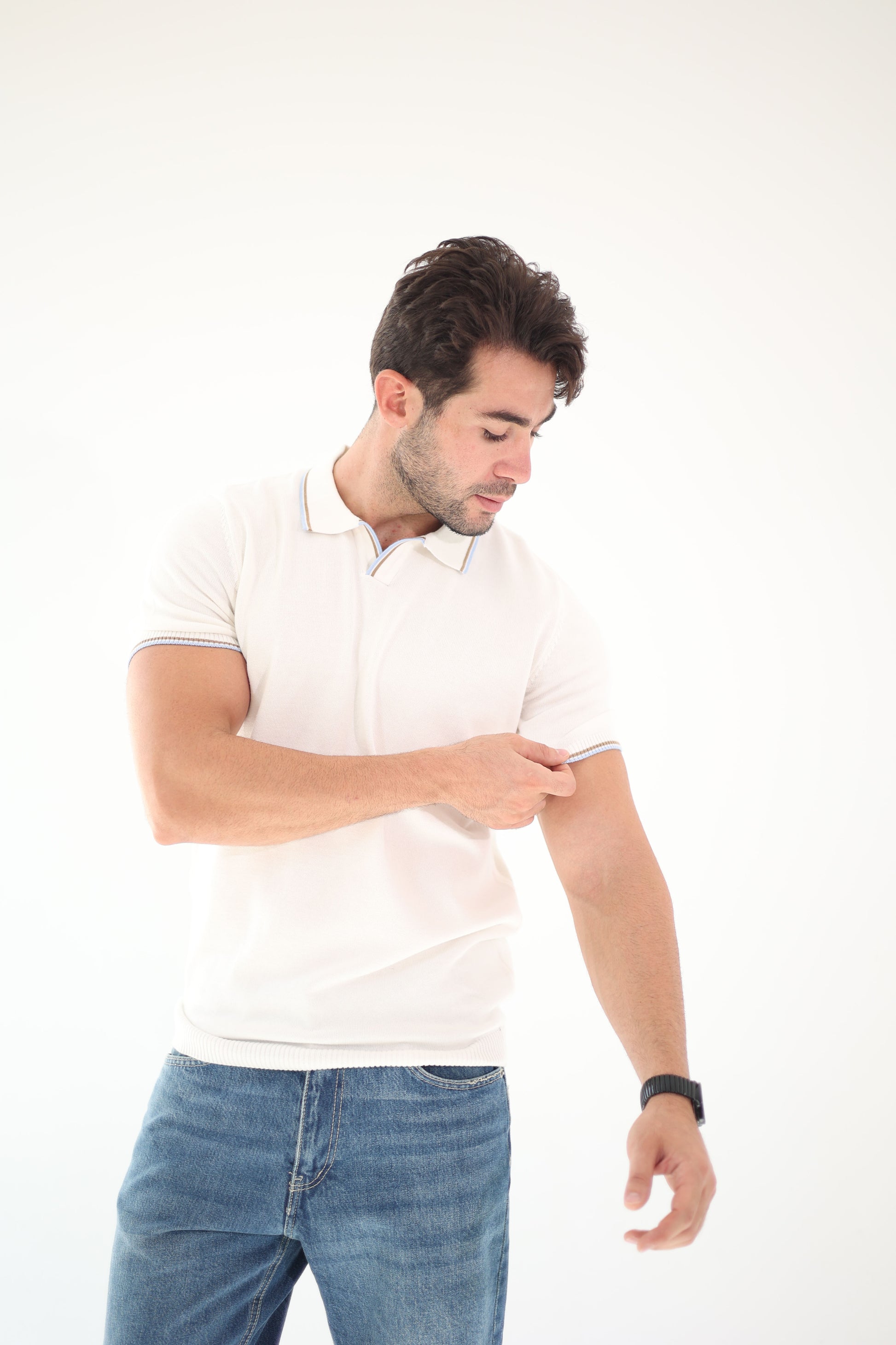بولو تريكو بلون أوف وايت أنيق، مع تفاصيل مميزة على الياقة والأكمام تضيف لمسة عصرية ناعمة.