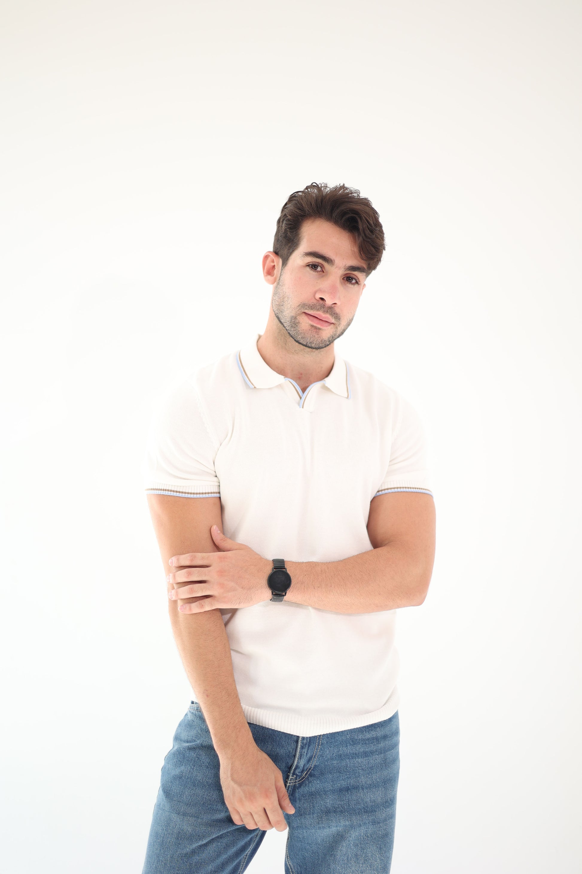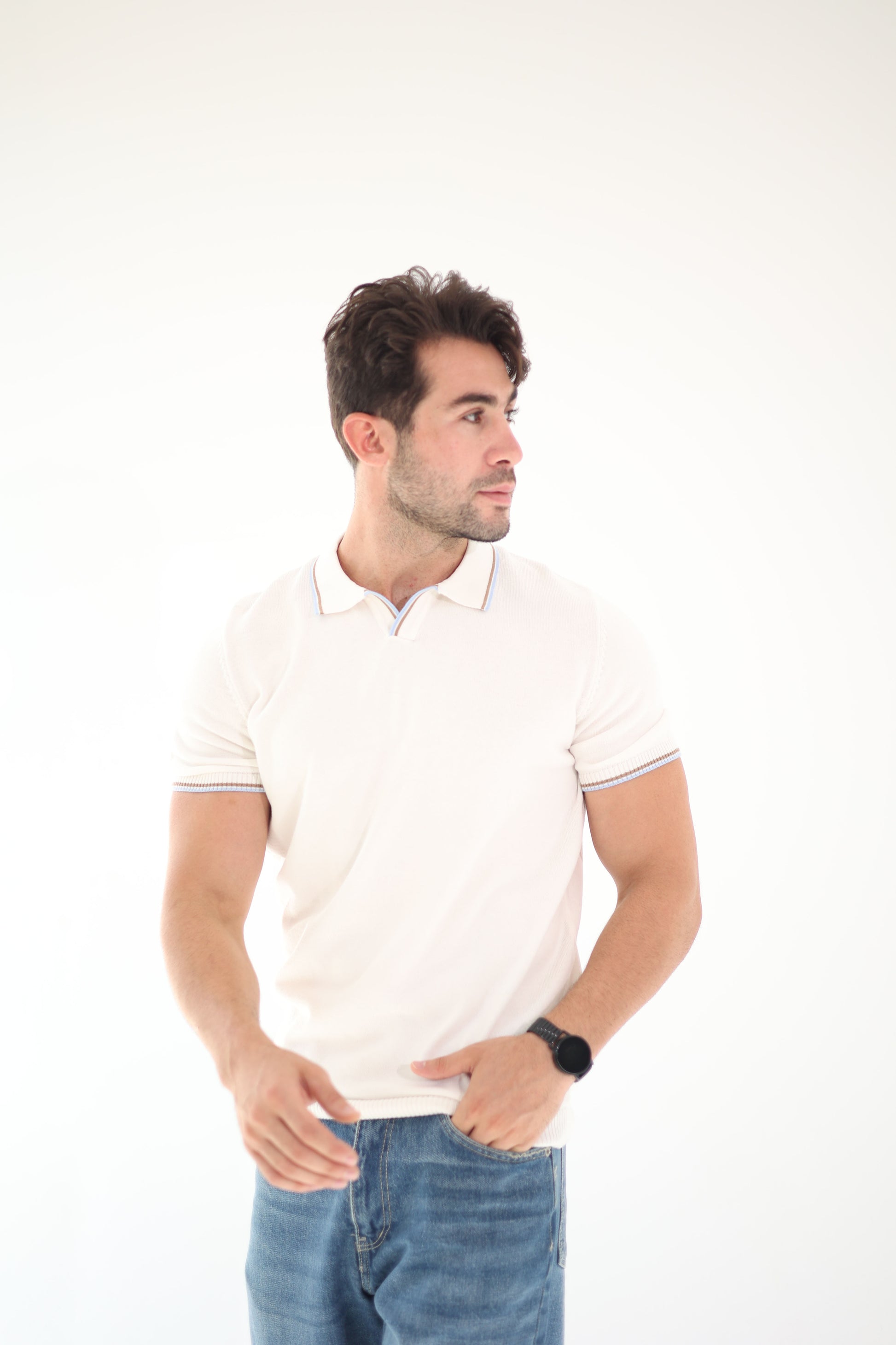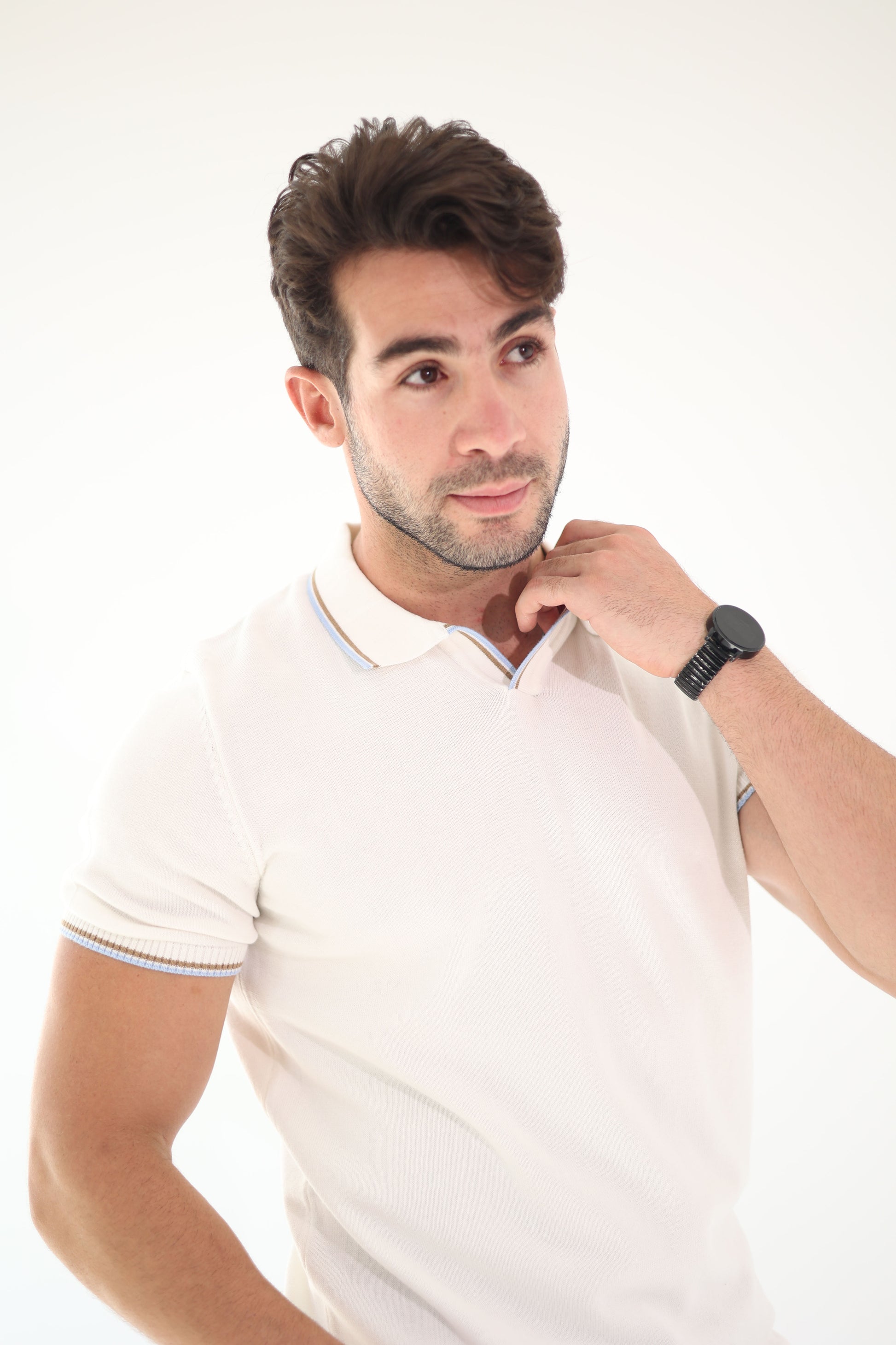 A fresh take on the classic knit polo — crafted in an elegant off-white with subtle contrast trims on the collar and sleeves.