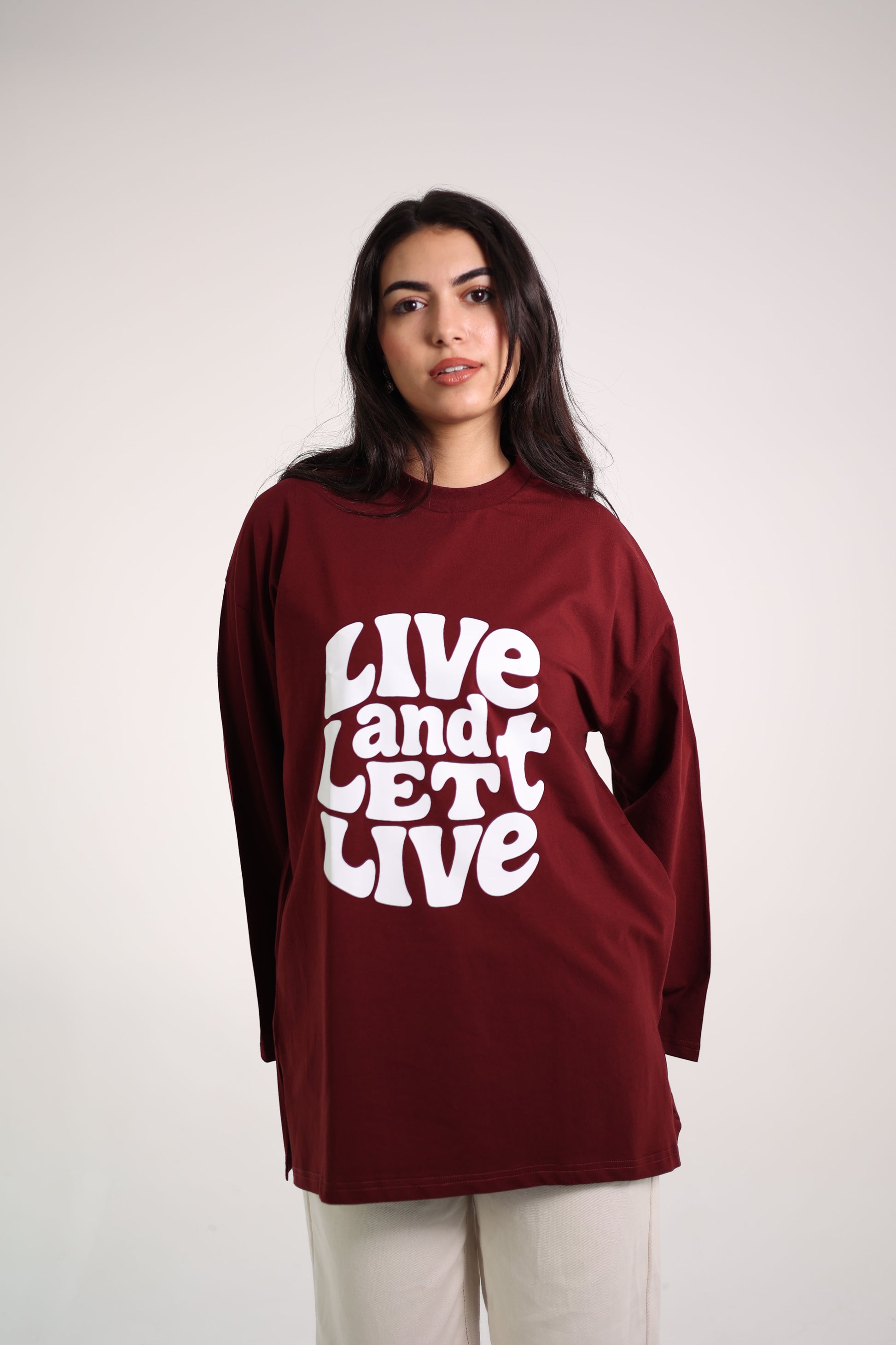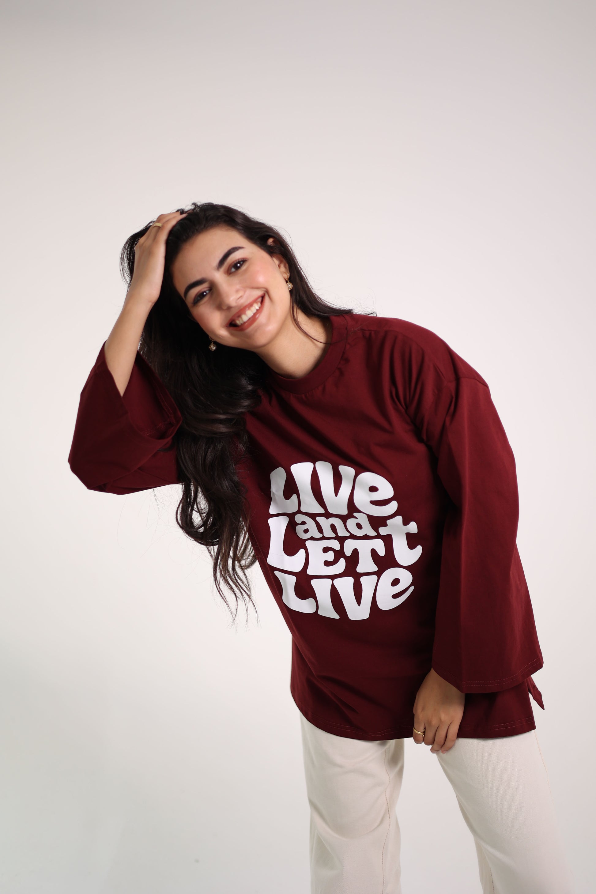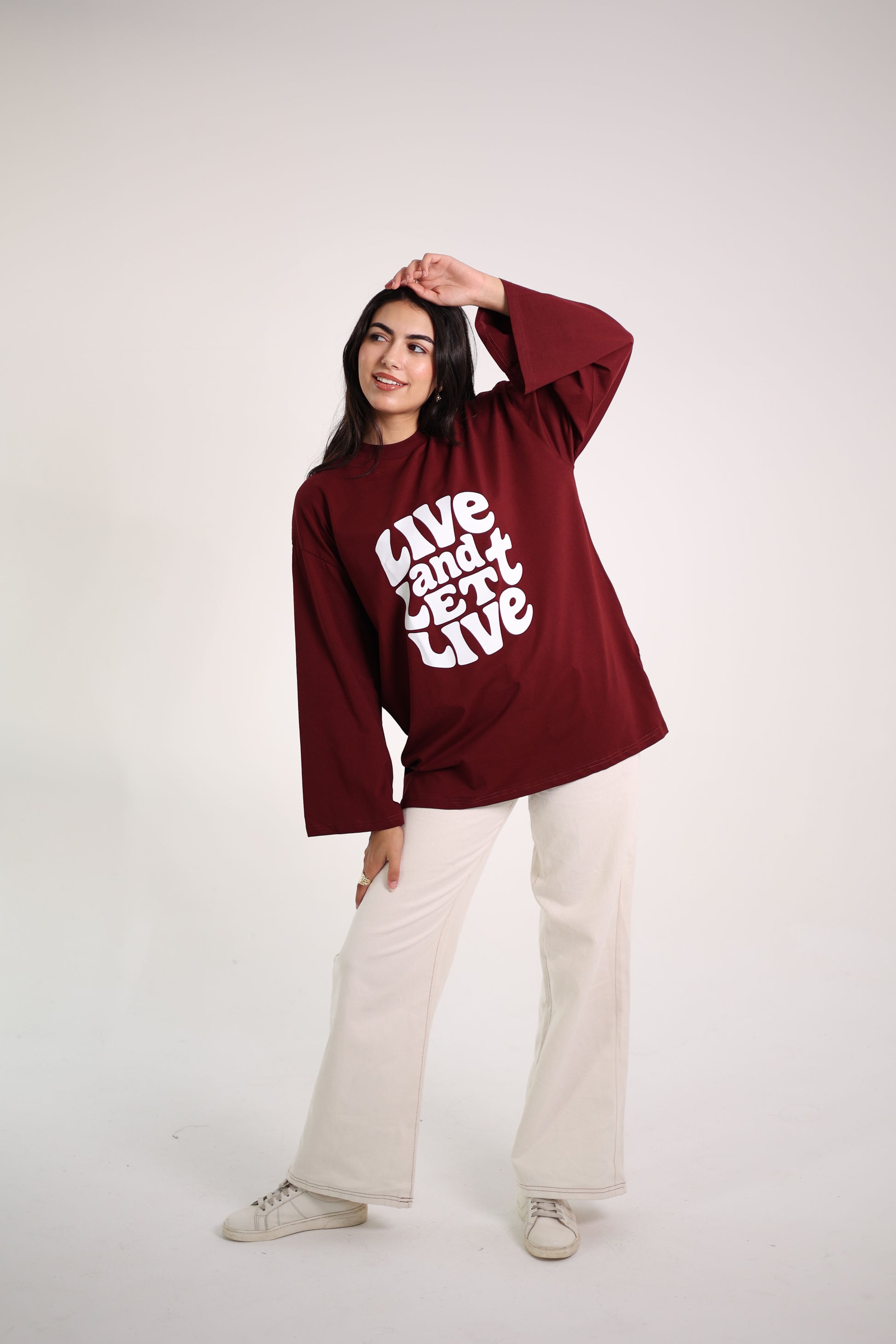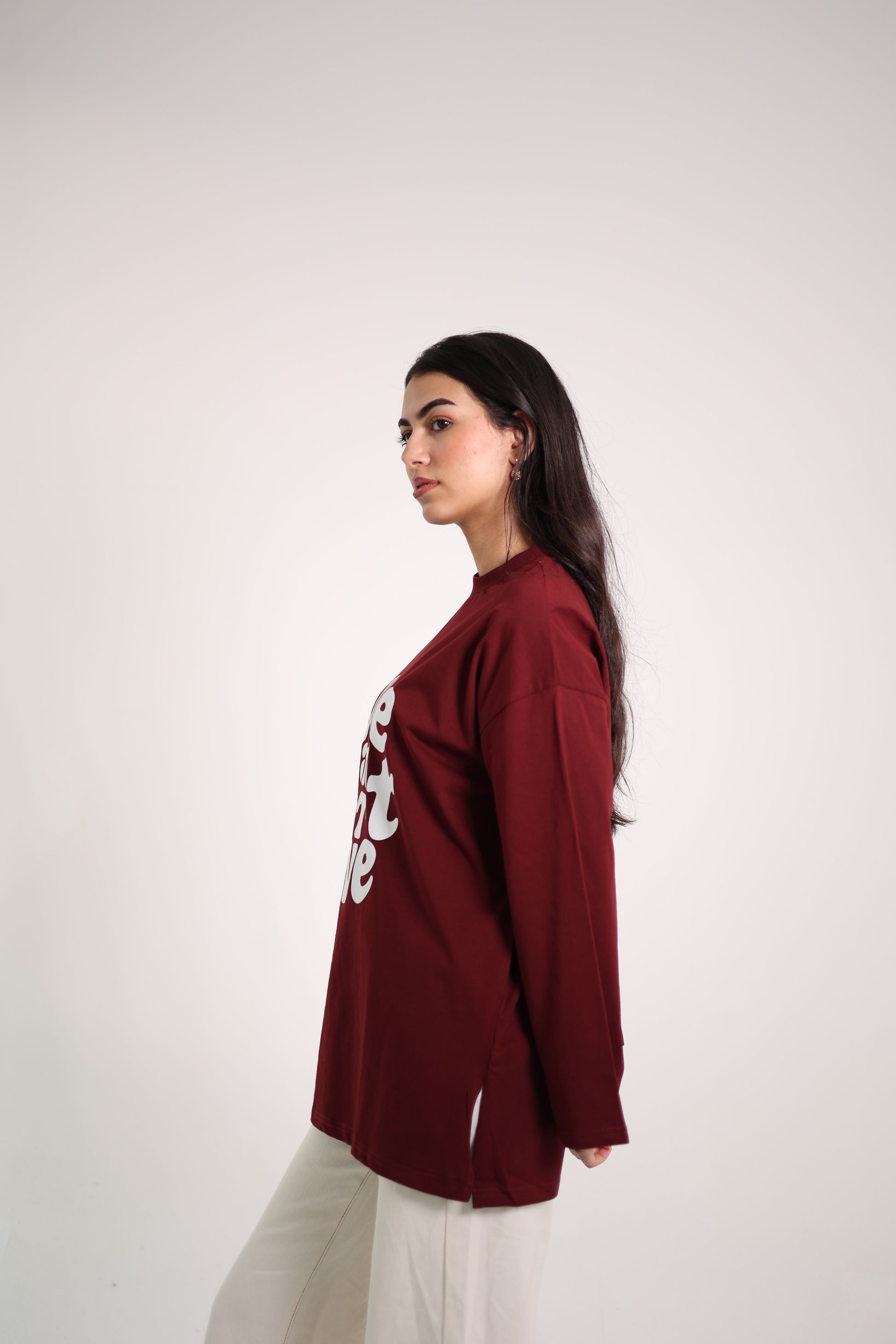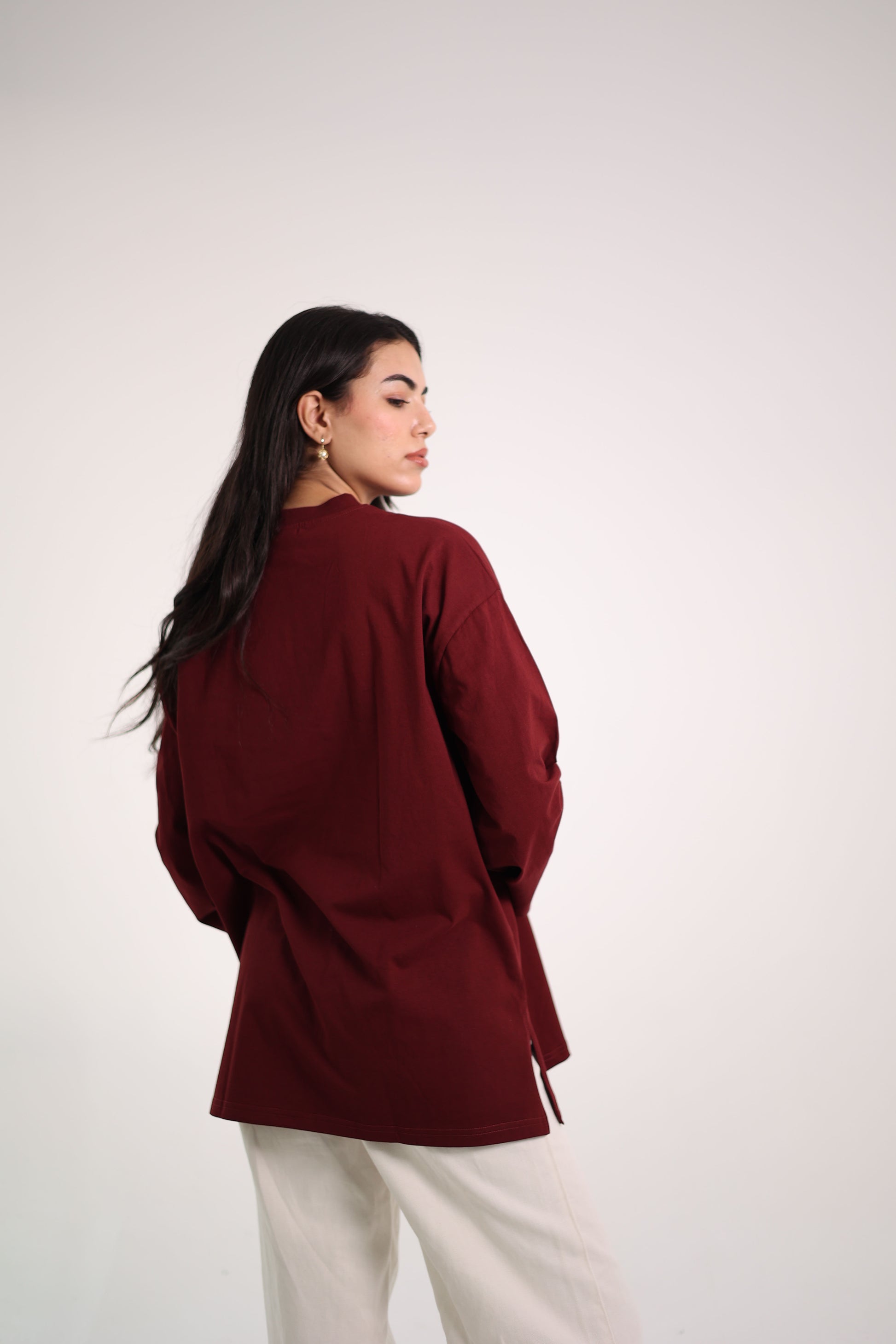 Printed Maroon long sleeves oversized t-shirt 100% cotton